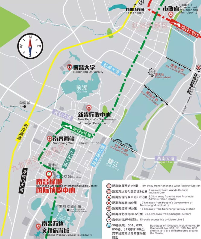 1:南昌火车站出发出租车:线路长度21公里,时间约为35分钟。推荐路线:从南昌火车站(3口)乘坐地铁2号线,到国博站(4口)下车,步行300米到达展馆。