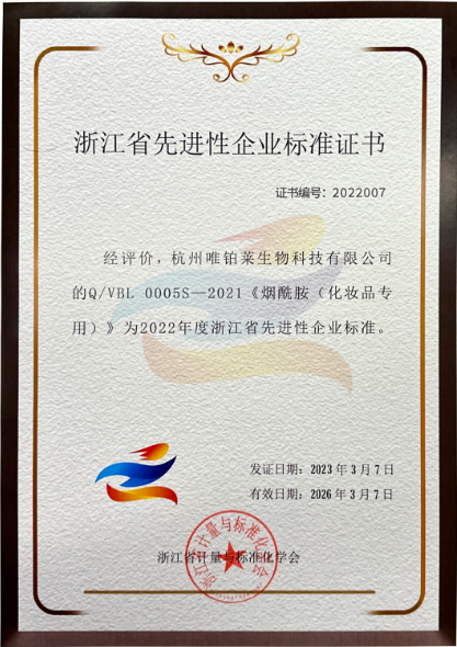 热烈庆祝太阳成集团官网《烟酰胺(化妆品专用)》被评为2022年浙江省先进性企业标准!日前,根据《国家标准化发展纲要》和《关于贯彻落实<国家标准化发展纲要>的实施意见》(浙委发〔2022〕11号)精神要求,浙江省计量与标准化学会在浙江省市场监管局的指导和监督下,经严格评审,授予17家企业的19项标准为2022年浙江省先进性团体标准、企业标准。太阳成集团官网《烟酰胺(化妆品专用)》名列其中。
