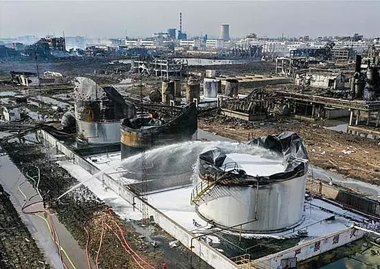 事故扩大的原因是爆炸区域有三个罐,其中两个苯罐,一个甲醛罐,将近4500立方米的物料同时燃烧。